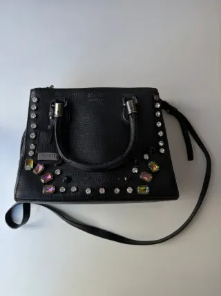 Elegante bolso vintage de cuero de la marca SCHUTZ. Un accesorio llamativo con detalles de pedrería. - Diseño texturizado. - Adornos de pedrería y cristales. - Asa de mano y correa. - Placa con el logo de la marca.