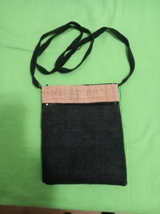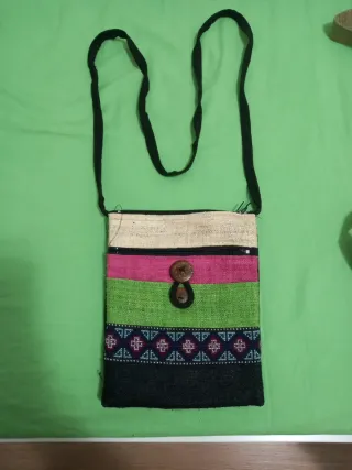 Bolso bandolera con un diseño colorido y original. - Tejido de yute y tela. - Tres cierres de cremalleras más una de botón. - Adorno de dos botones de madera. - Sin marca.