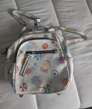 Bolso tipo mochila de la marca Parfois con un divertido estampado. - Diseño con sombrillas y toallas de playa. - Base blanca con detalles multicolor. - Cremallera principal y bolsillo frontal. Con varias cremalleras Nueva con etiquetas