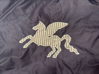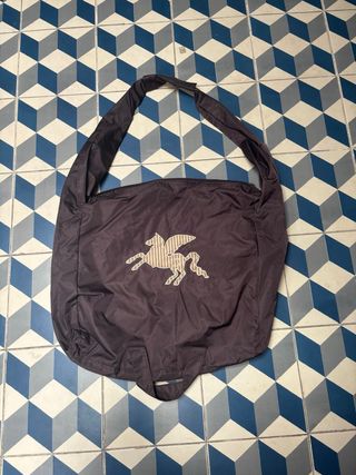 Bolso grande de la marca El Caballo con un diseño de caballo alado. - Color marrón con detalles en beige y rayas. - Asa larga para llevar al hombro. Como en las fotos se indica, tiene una mancha en la parte inferior. El resto está perfecto.