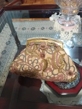 Elegante bolso de mano de seda con un delicado diseño de encaje. - Tonos beige y rosa. - Cierre metálico dorado. - Adornos florales.