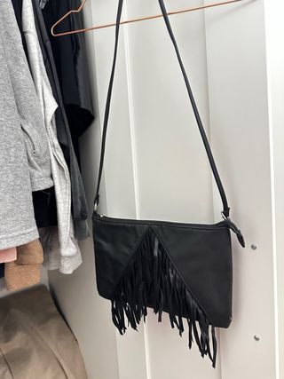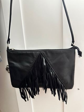 Bolso de mano negro con un diseño moderno y llamativo. - Adornado con flecos decorativos. - Cierre de cremallera. - Correa para llevar al hombro.
