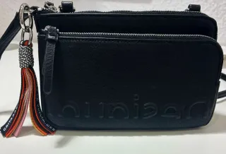 Bolso de mano o bandolera en color negro con un diseño moderno y elegante. Perfecto para llevar tus esenciales con estilo. - Logo de la marca grabado en relieve en la parte frontal. - Múltiples compartimentos con cremallera para una mejor organización. - Detalle de borla decorativa con tiras de tela y cinta con texto. - Correa ajustable para llevar al hombro o cruzado.