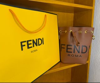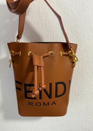 Bolso de la marca Fendi. - Color marrón con detalles amarillos. - Diseño tipo cubo con cierre de cordón.