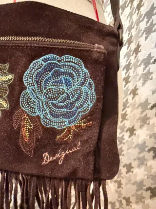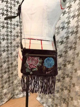 Bolso de la marca Desigual con un diseño único. - Material de ante. - Adornado con bordados de flores en tonos rojos y azules. - Detalle de flecos en la parte inferior. - Dos compartimentos con cremallera.