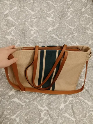 Bolso tote de lona con un diseño moderno y práctico. *La marca no es la correcta pero no podía subirlo sin marca. - Varios bolsillos interiores para organizarse. - Dos asas de cuero marrón. - Correa de hombro ajustable y extraíble. - Detalle de tres rayas verticales en color verde. - Acabado en lona de color beige.