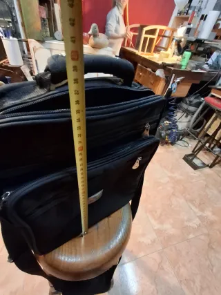 Bolso negro tipo maletín, ideal para viajes o uso diario. Cuenta con varios compartimentos para organizar tus pertenencias. - Asa superior acolchada. - Correa de hombro ajustable y extraíble. - Múltiples bolsillos con cremallera.
