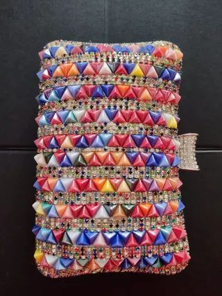 Elegante bolso de mano adornado con múltiples detalles. - Diseño llamativo con tachuelas y pedrería. - Cierre de clip con forma de lazo.