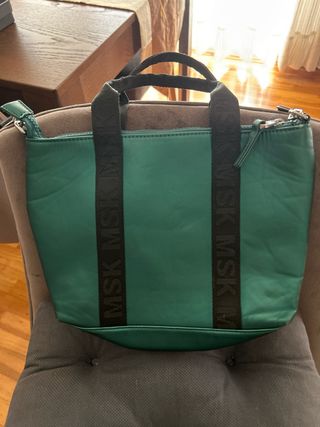 Bolso de mano y bandolera de la marca Misako. - Color verde. - Cierre con cremallera. - Dos asas cortas y una correa larga ajustable. - Detalle de logo circular en la parte frontal. - Micro detalles de desgaste, por dicha causa el precio.