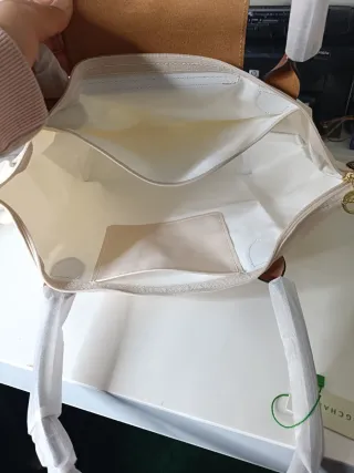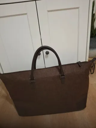 Bolso de mano y hombro con un diseño moderno y elegante. Completamente nuevo, sin usar y con la etiqueta puesta. - Combinación de lona beige y detalles en piel marrón. - Asas superiores y correa de hombro. - Acabado trenzado en las asas. - Precio original: 160€ - Estado: Nuevo. - Con etiqueta original. Es un bolso elegante y versátil, ideal tanto para diario como para ocasiones especiales. Material y acabados de gran calidad, como caracteriza a la marca.