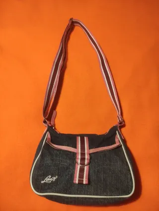 - Bolso tipo bandolera de la marca Levi's. - Diseño en tela vaquera. - Tira ajustable con detalles en rosa y granate. 1'25 cm. - Adorno de cinta con hebilla metálica. - Bolsillo exterior e interior. - 25 x 18 x 10 cm. - En buen estado.