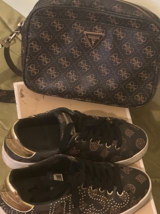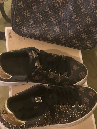 Conjunto de bolso y zapatillas a juego de la marca Guess. Originales - Bolso con estampado de monograma. - Zapatillas con detalle de tachuelas y detalles dorados.