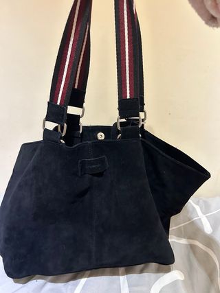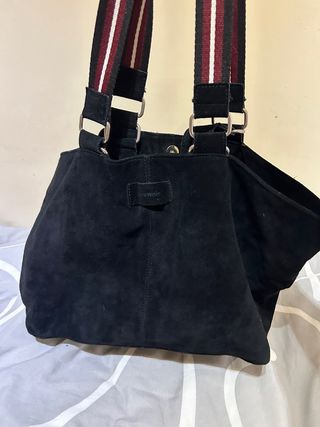 Bolso de piel/ante en color negro de la marca Brownie. - Asas con diseño de rayas en tonos burdeos, blanco y negro. - Cierre de botón a presión. - Bolsillo interior.