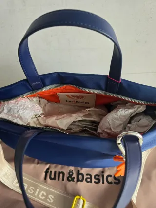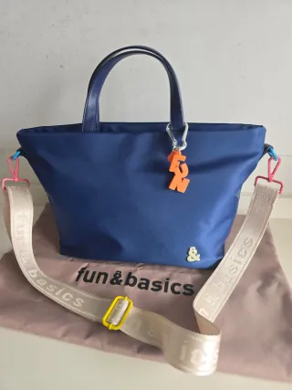 Bolso de mano y bandolera de la marca Fun&Basics. Un accesorio versátil y moderno. - Diseño en color azul. - Incluye correa bandolera ajustable. - Detalle de charm con las letras FUN. - Bandolera extraíble. - Compartimento con cremallera. - Bolsillos interiores y exterior. - Medidas: 30 x 14 x 25 cm.