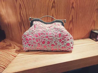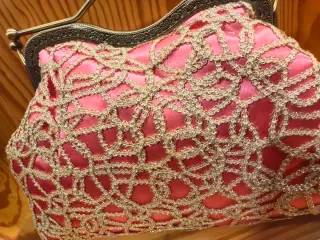 Elegante bolso de mano de estilo vintage. Interior forrado en terciopelo martele Boquilla metálica Su diseño combina un vibrante color rosa con detalles dorados Medidas 35 cm ancho 25 cm alto 15 cm fondo - Acabado con encaje intrincado. - Marco metálico con cierre. - Asa superior. - Diseño tipo clutch.