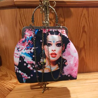 Bolso de mano con un diseño llamativo y un toque retro Medidas 30 cm ancho 35 cm alto Asa para colgar en bandolera Interior forrado en terciopelo martele - Estampado en las dos caras con Nina - Cadena metálica para llevar al hombro. - Marco superior con cierre de boquilla.