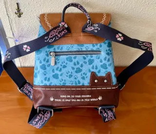 Bolso de estilo mochila con un diseño único y llamativo. - Cierre de solapa con detalle de costura. - Estampado frontal con motivos de gatos y marcos. - Correas ajustables con detalles. - Acabados en cuero sintético.