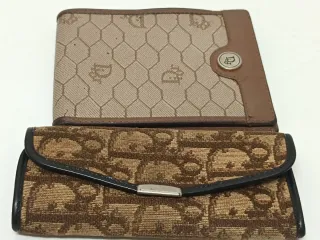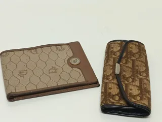 Conjunto vintage de cartera y llavero de Christian Dior. Cartera con estampado de la marca y detalles en piel. - Llavero con el icónico logo de la marca. Desgaste , ver fotos