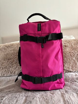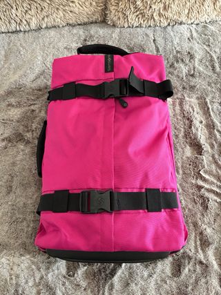 Maleta Samsonite de color fucsia vibrante, con un diseño moderno y práctico. Usada solo en dos ocasiones. - Cintas de sujeción con hebillas. - Asa superior de transporte. - Logo de la marca visible. - Medidas 55x35x22