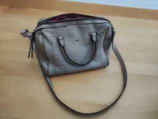 Elegante bolso de mano con un diseño moderno. - Acabado en tono gris con detalles metálicos plateados. - Asa cómoda para llevar en la mano. - Extra correa para llevar como bandolera.