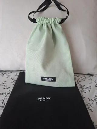 Conjunto de bolsa-neceser de la marca Prada. - Bolsa de tela en color verde menta con cierre de cordón. - Neceser-bolsa pequeña en color negro con etiqueta Prada Beauty. -Ver medidas en las fotos