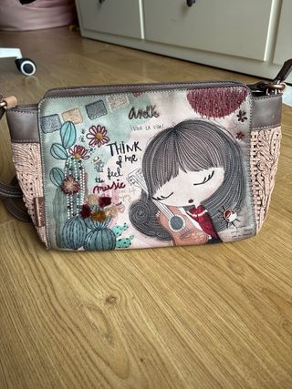 Bolso de la marca Anekke con un bonito estampado. - Diseño con una chica tocando la guitarra. - Detalles de cactus y flores. - Frase VIVA LA VIDA! y THINK of me. - Cierre de cremallera. -Correa expansible -Perfecto estado