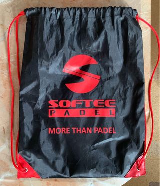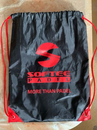 Práctica bolsa tipo mochila con cierre de cuerdas. Ideal para llevar tus pertenencias. - Cierre de cordones. - Detalle de esquinas reforzadas en rojo. - Logo de la marca SOFTEE en la parte frontal.