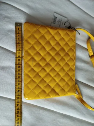 Bolso de mano con un diseño acolchado y acabado brillante. - Color amarillo - Acolchado tipo rombos. - Cierre de cremallera. - Bolsillo interior con cremallera - Medidas en las fotos. Sin estrenar, con la etiqueta. Tiene unas marcas en la parte interior de haber estado guardado