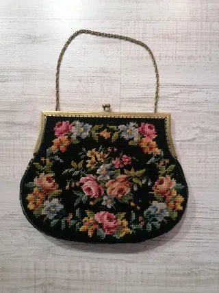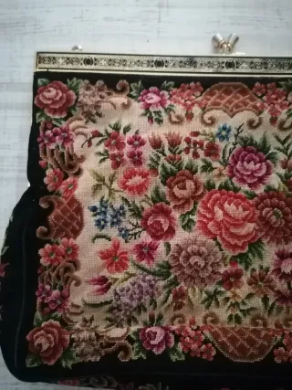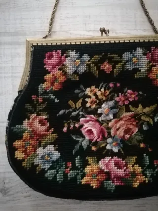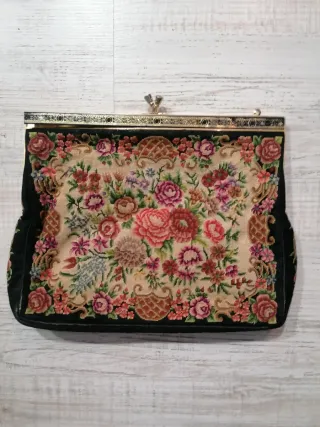 Elegante bolso de mano de los años 50 con un precioso bordado floral. 19x 25 cm - Diseño de punto de cruz. - Marco metálico dorado. - Cierre de boquilla. Ha perdido uno de los ganchos para llevarlo colgado.