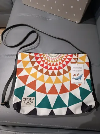 Bolso con un diseño geométrico vibrante y llamativo. - Estampado con motivos circulares y triangulares. - Correa ajustable para llevar al hombro. - Etiqueta de la marca Cecilia Plaza Valencia.