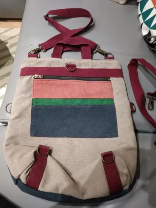 Bolso de la marca NUMON con un diseño moderno y colorido. - Combinación de beige con franjas horizontales en rojo, rosa, verde y azul marino. - Tejido con textura y detalles de costura visibles. - Correa de hombro ajustable y asas superiores. También tiene la posibilidad de convertirse en mochila. - Dimensiones: 35x42. - Bolsillo interior, sin cremallera, de tres compartimentos.