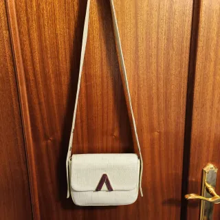 Bolso de mano con un diseño texturizado que imita la piel de cocodrilo. - Color beige - Cierre de solapa. - Detalle metálico en forma de V invertida en la parte frontal. ( Detalle de la marca). - Correa ajustable para llevar al hombro.