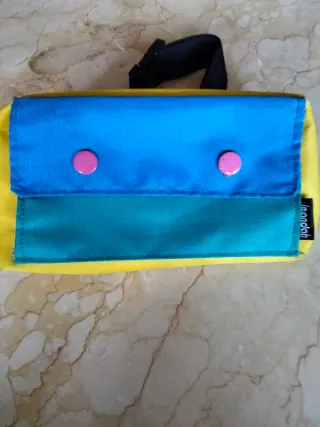 Bolso riñonera con un diseño vibrante y llamativo. - Cierre de botón a presión. - Asa negra. - Etiqueta de marca visible.