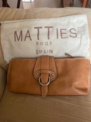 Elegante bolso de mano de la marca Matties, perfecto para añadir un toque de tendencia a tu estilo. - Diseño alargado y estilizado. - Cierre con solapa y detalle de anilla metálica. - Costuras decorativas en contraste. - Logo de la marca grabado en la parte frontal. Cuero de excelente calidad color camel. Fabricado en España. Bolsillo exterior y dos bolsillos interiores. Medida: 34 x 14 cm Incluye correa larga de 1,24 m y correa corta de 55 cm