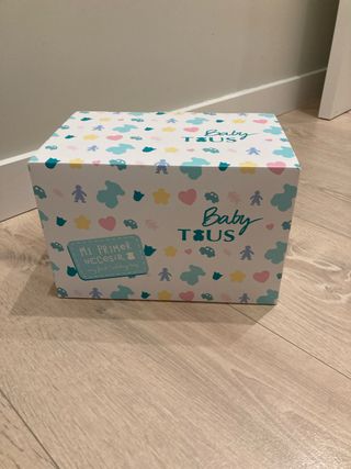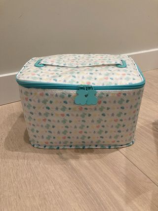 Neceser de la marca Tous para bebé, con un diseño alegre y colorido. - Estampado con nubes, corazones y figuras. - Cierre de cremallera.
