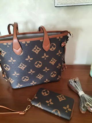 Conjunto de bolso y cartera a juego, ambos sin estrenar. - Diseño con estampado monogram. - Ribetes y asas en color marrón. - Incluye correa para el bolso y pulsera para la cartera.