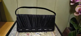 Elegante bolso de mano para eventos especiales. - Diseño plisado vertical. - Adorno de pedrería en la solapa. - Cadena metálica plateada para llevar al hombro. - Asa de mano - Las asas son intercambiables Medidas 24 cm x 11 cm (sin contar asa de mano)