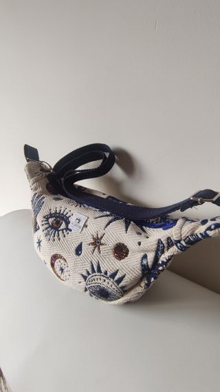 Bolso con un diseño único y llamativo. - Estampado de ojos, soles y lunas. - Ribete y correa en color azul marino. - Pequeña etiqueta de marca cosida.