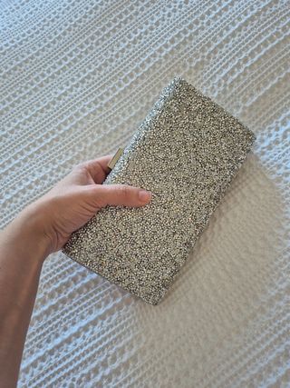 Bolso de mano para fiestas y eventos color gris plata con pedrería plateada y cadena que se puede esconder dentro. Pequeña marca en un lateral. Usado una vez.