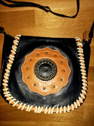 Bolso de piel sintética con decoraciones estilo marroquinería. Cremallera y apartado interior. Unos 22x26cm. Asa regulable. Sin uso. EXCLUSIVAMENTE POR ENVÍO. No entrego en mano. Vendo por Wallapop Envíos. ¡¡15% DE DESCUENTO A PARTIR DE 30€!!