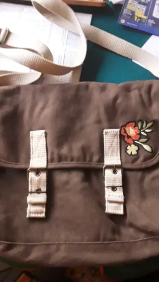 Bolso de tela con un diseño único y un toque floral. - Parche bordado de flor y hojas. - Cierre con correas y hebillas. - Material de tela resistente.