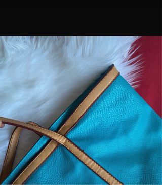 Bolso de la marca Misako con un diseño moderno y espacioso. - Color principal azul turquesa. - Ribetes y asas en color marrón. - Material con textura. - Asas largas para llevar al hombro.