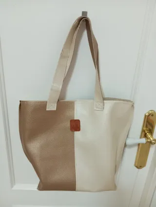 Bolso de polipiel con un diseño bicolor. - Combinación de rosa y beige. Otro beige y marrón - Detalle de etiqueta marrón. - Asas cómodas Hecho artesanalmente.Unico Precio por unidad