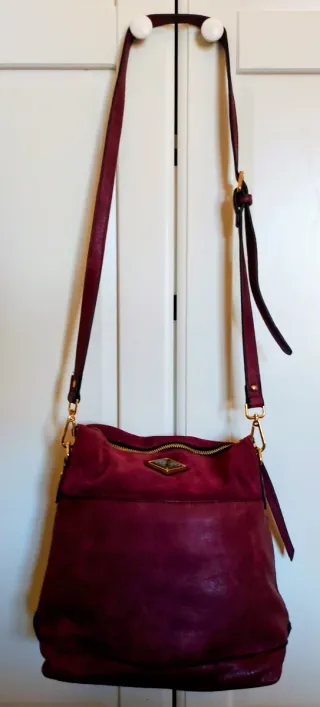 Bolso de piel en color granate Un accesorio elegante y versátil. - Material: Piel genuina. - Diseño con textura. - Cierre de cremallera superior. - Detalle de flecos.