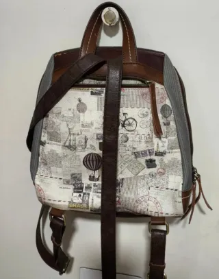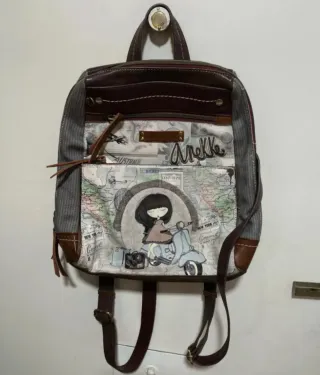 Mochila de la marca Anneke con un diseño único y original. - Estampado de mapa y personaje. - Detalles en piel sintética. - Cierre de cremallera. - Prácticamente está muy bien, como nueva, lo único los tres pequeños desperfectos que aparecen en las 3 últimas fotos. Rozaduras que puedes disimular con pintauñas del mismo color