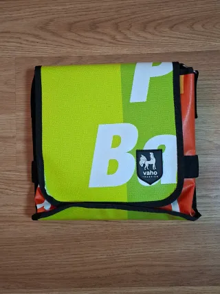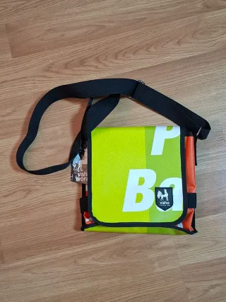 Bolso bandolera de la marca Vaho Trashion. - Diseño llamativo con bloques de color verde y naranja. - Cierre de solapa con detalle de logo. - Ribete negro alrededor del bolso. - Pequeño bolsillo interior Medidas 27x27