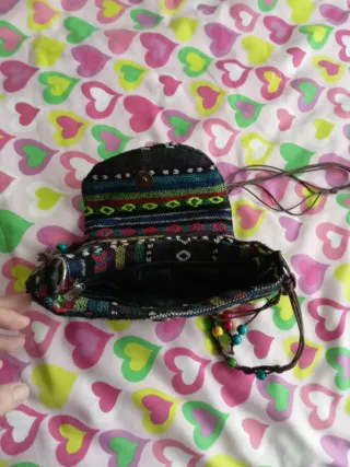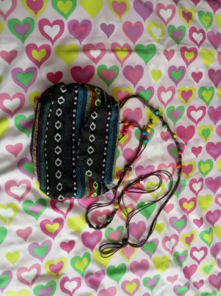 Bolso pequeño de tela con un diseño étnico y detalles de abalorios en la correa. - Tejido con rayas multicolores y motivos geométricos. - Correa ajustable con cuentas de colores. - Cierre de cordón.