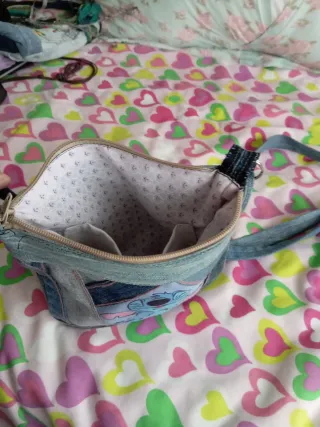 Bolso bandolera de tela vaquera con un diseño único. - Parche central de Stitch. - Combinación de diferentes tonos de tela vaquera. - Correa ajustable para llevar al hombro o cruzado.