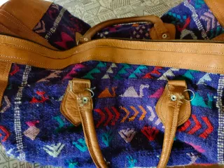 Bolsas de estilo marroquí con un diseño tejido vibrante y detalles en piel. - Tejido principal con patrón geométrico. - Asas y ribetes de piel. - Combinación de colores llamativa .