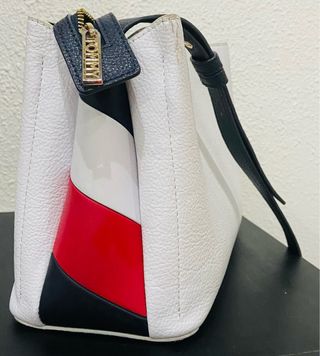 Bolso original de Tommy Hilfiger con un diseño moderno y llamativo. - Acabado texturizado en blanco. - Detalle de franjas en rojo y azul marino. - Dos ojales metálicos dorados en la parte superior. - Logo metálico dorado de la marca en el centro.